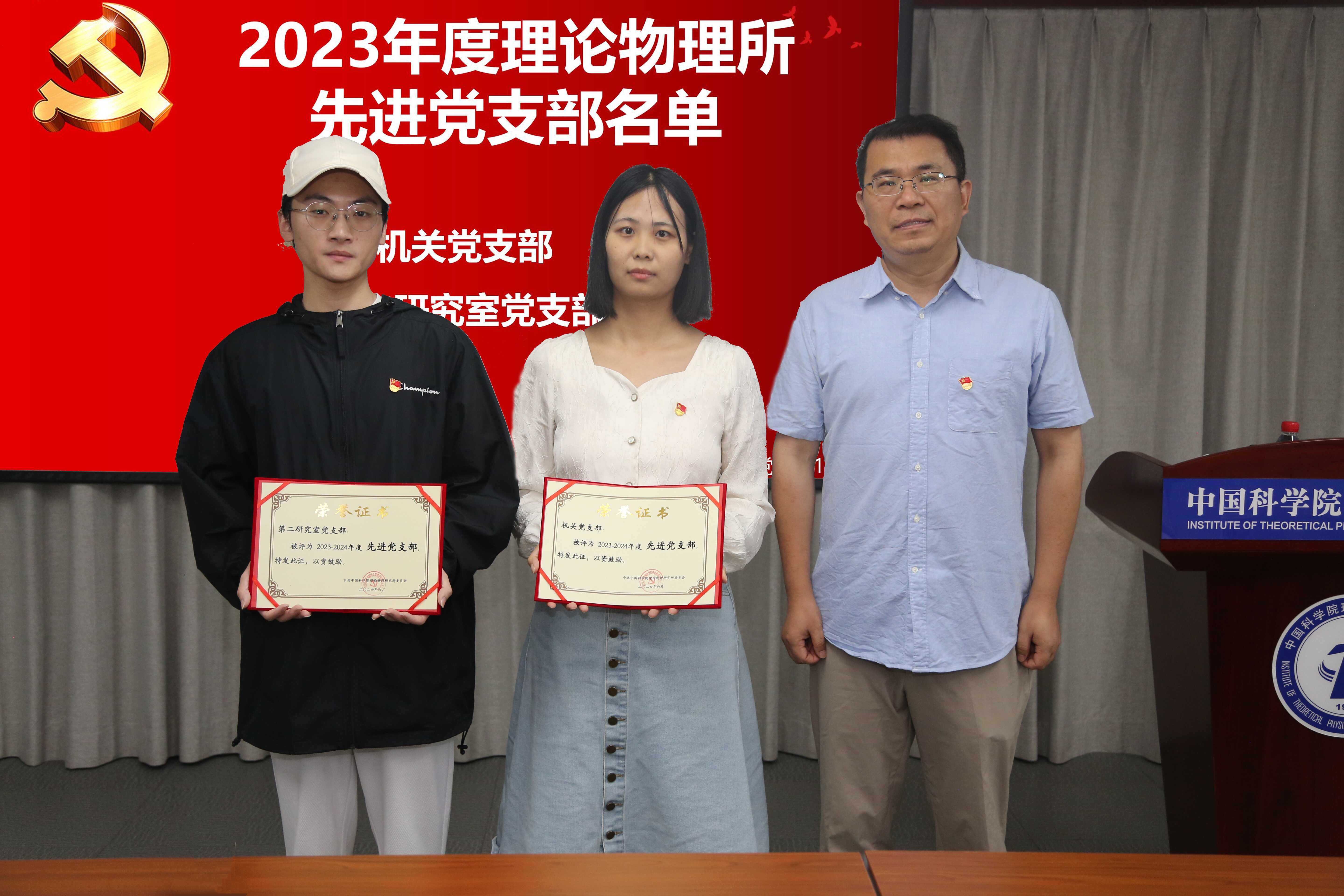 在表彰和颁奖环节,樊志军为荣获2024年度“光荣在党50年”纪念章的老党员颁发了纪念奖章。周宇峰宣读了理论物理所党委表彰决定(理物发党字〔2024〕20号),于江浩为13名优秀共产党员、2个先进党支部颁发了荣誉证书。