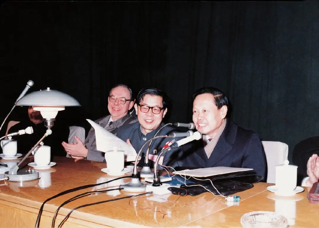 上,米尔斯、周光召、杨振宁在一起(1984年12月)