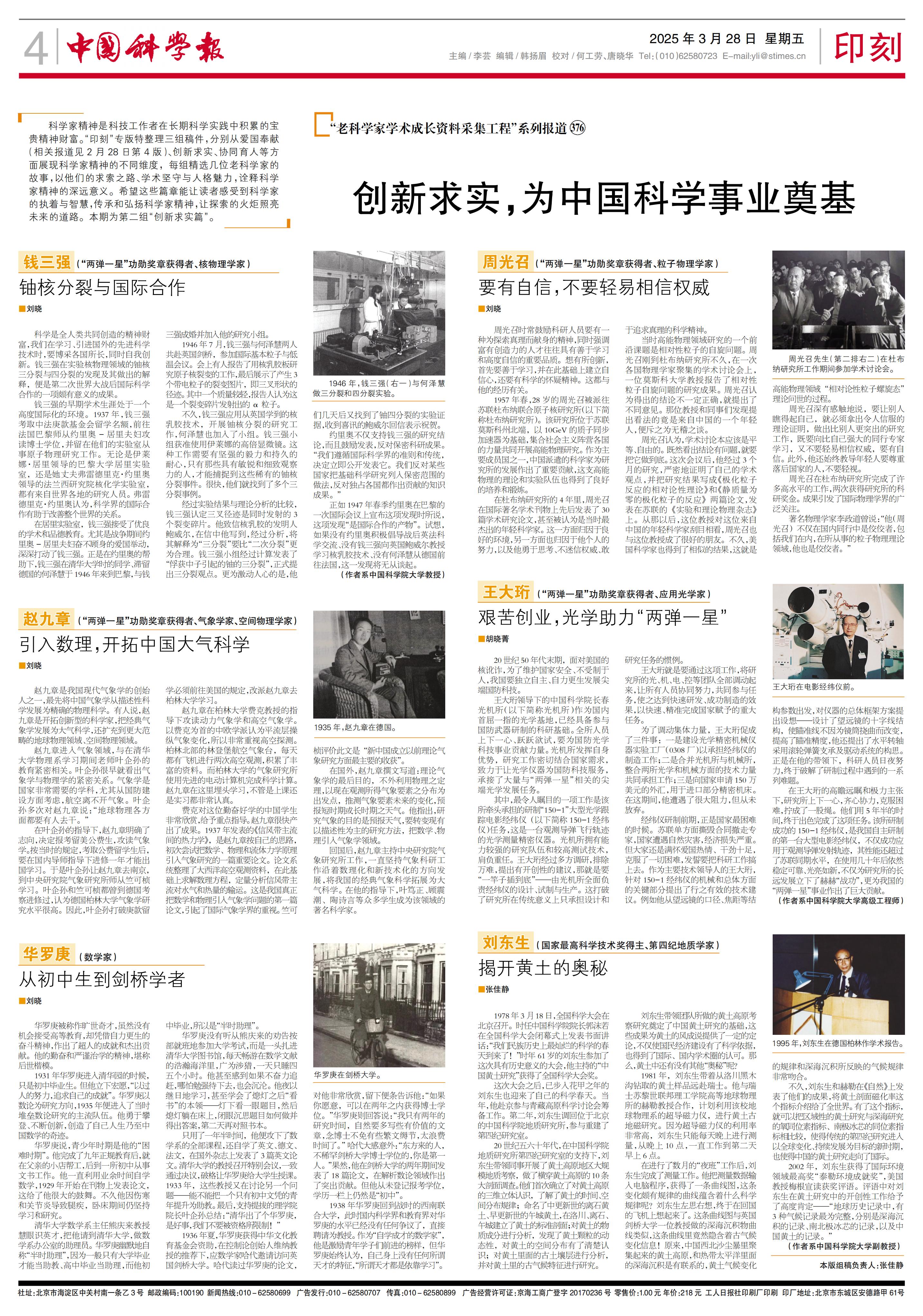 周光召时常鼓励科研人员要有一种为探索真理而献身的精神,同时强调富有创造力的人才往往具有善于学习和高度自信的重要品质。想有所创新,首先要善于学习,并在此基础上建立自信心,还要有科学的怀疑精神。这都与他的经历有关。