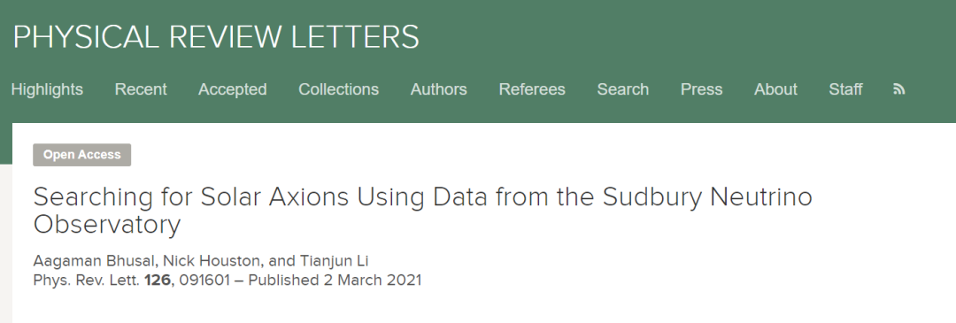 beplay网页版本 李田军研究员, 北京工业大学理学部国际教师Nick Houston博士,以及beplay网页版本 博士研究生Aagaman Bhusal 同学创新性提出了利用SNO 实验结果开展轻型暗物质或长寿命粒子的探测研究,并首先于太阳轴子探测研究中取得进展。