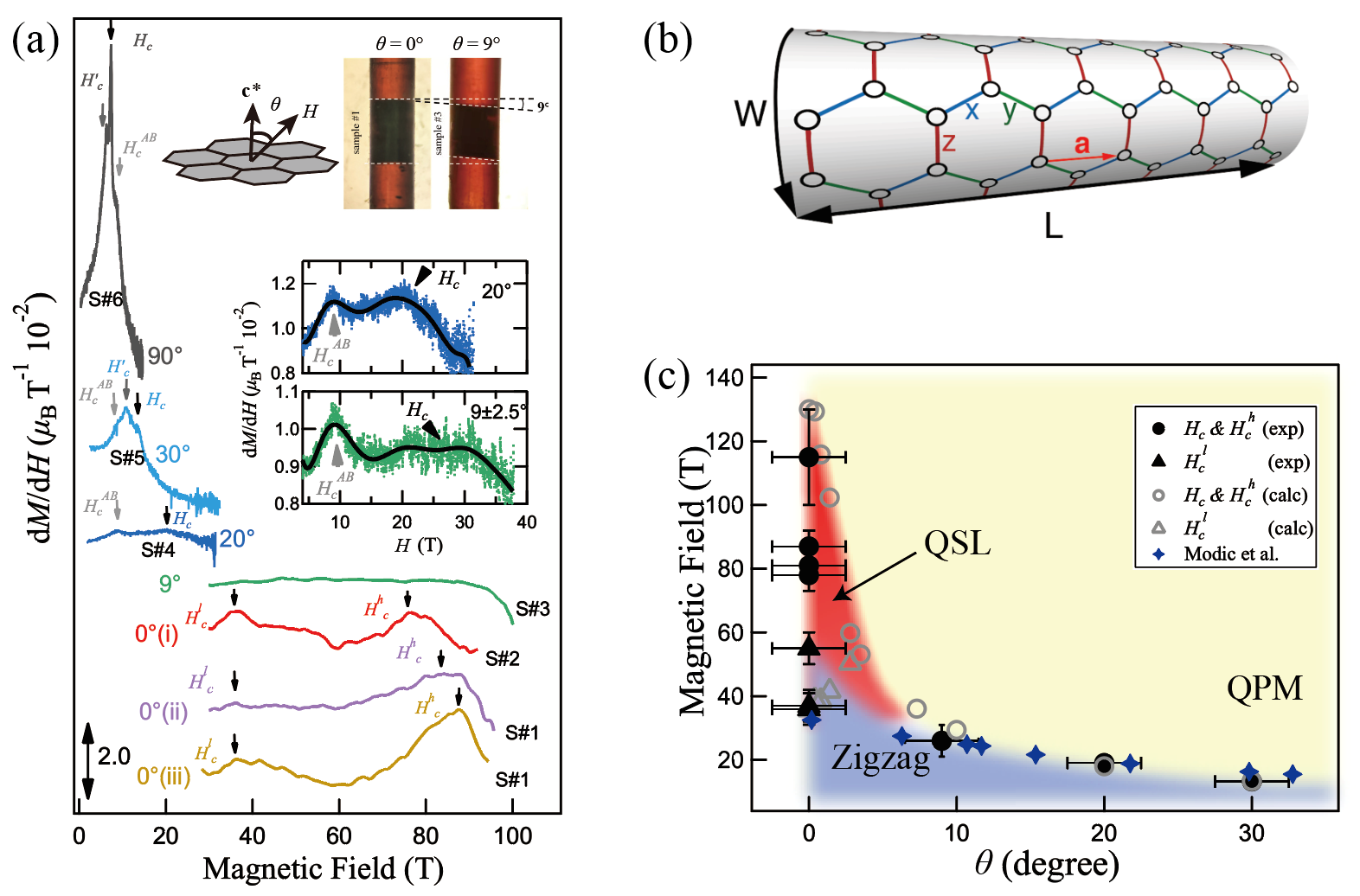 强磁场实验是在强磁场环境下对物质的性质开展探索的实验,是一种极端条件下的前沿科学实验。目前,国际上少数先进的脉冲磁场实验室可以做到兆高斯(百特斯拉)级,即地磁场的数百万倍、通常永磁体表面磁场的数百到数千倍。近日,理论物理所李伟研究员课题组与日本东京大学国际强磁场实验室Matsuda研究组通力合作,利用兆高斯(100特斯拉)级的强磁场,验证了此前所提出的理论预言[4,5],找到了35特斯拉和100特斯拉附近的磁场诱导量子相变的证据,支持了强磁场自旋液体在a-RuCl3中的存在(图1a)。进一步地,李伟研究员和博士生李涵(现为中国科学院大学卡弗里理论科学研究所博士后)基于此前所提出的理论模型[4],针对转角度高场实验开展了磁场-转角相图的密度矩阵重正化群计算(图1b),结果与最新强磁场实验定量符合(图1c),有力地支撑了a-RuCl3在强磁场中存在自旋液体中间相的结论。该工作为探索实际Kitaev材料中的自旋液体、研究其新奇量子性质开辟了新的战场。