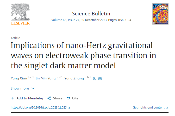 理论物理所研究员杨金民与博士生肖洋、郑州大学青年教师张阳博士合作,提出纳赫兹引力波可能源于希格斯粒子和暗物质相互作用引发的早期宇宙过冷电弱一级相变,从而把引力波和希格斯粒子以及神秘的暗物质联系在一起,共同揭示宇宙婴儿期历史。近日,相关研究成果发表于Science Bulletin 68 (2023) 3158。