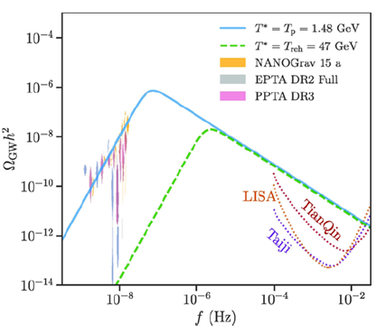 文章主要结果如下图所示,这个图中的蓝色实线对应于过冷相变产生的引力波谱,若考虑到相变所释放的能量所可能导致的重加热(reheat)现象,引力波谱则向右下方移至绿色虚线。从这图可以看到,这一理论所预言的引力波的极低频纳赫兹部分可以被正在进行的中国天眼和欧美的脉冲星测时阵列所检验,而高频部分的引力波可以被未来的引力波探测实验(中国的天琴和太极以及欧洲的LISA)所检验。此外,这一研究还揭示了如此过冷的低温相变发生在暗物质冻结之后,相变所释放的能量导致的熵增加对暗物质丰度可能会有显著的稀释效应,这使得暗物质满足目前的观测限制。