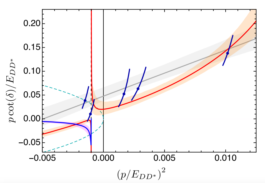 强子是由带颜色的夸克和胶子构成的无色的粒子。传统的夸克模型中,强子包括由三个夸克构成的重子以及由一对正反夸克构成的介子,超出这些构型的强子被称为奇特强子态。近二十年来,世界各大高能实验发现了大量的奇特强子态的候选者。对这些奇特强子态结构和性质的研究是当前强子物理的热门研究领域。对于多夸克态(比如两对正反夸克组成的四夸克态或四个夸克和一个反夸克组成的五夸克态)而言,其内部夸克的分布有不同的可能性。一种可能是,不同的夸克(或反夸克)先结合形成无色集团,继而通过强相互作用的剩余相互作用形成类似分子的结构;在此情形下,色禁闭发生在无色的子集团内。另一种可能是,多夸克态内部没有更小的无色集团,从而色禁闭在所有夸克之间都起到重要作用。由此可见,研究清楚多夸克态的内部结构对理解色禁闭这一基本问题是很重要的。两个强子之间的低能散射蕴含着与它们相耦合的多夸克态内部结构的重要信息,是诸多理论和格点 QCD 计算研究的对象。