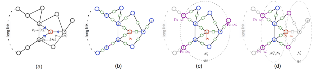 图1:消息传递算法(a)、张量网络方法(b)、张量网络消息传递算法计算单变量边缘概率(c)与计算空腔张量(d)的图示。