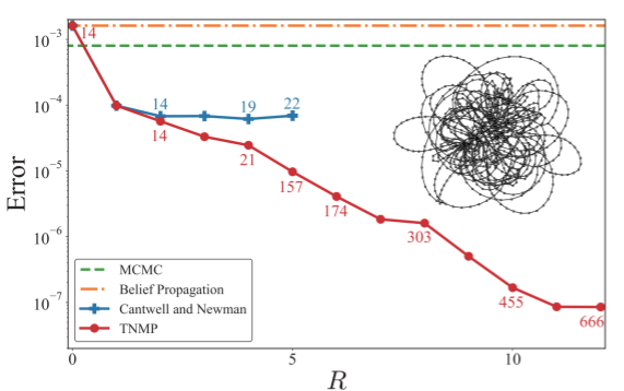 图2:TNMP在人工合成网络[7]上的铁磁Ising模型(左图)与现实世界网络[8]上的自旋玻璃模型(右图)中均表现出了优越的计算精确度,并有能力在可接受的计算成本下达到机器精度。