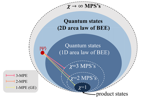 基于张量网络,研究团队创新性地将矩阵乘积态作为参考流形,提出了一种全新的多体纠缠度量方法,引入了新的物理量:特定χ矩阵乘积纠缠(χ-specified matrix product entanglement, 简写为χ-MPE)。其核心思想是:与传统几何纠缠仅考虑与乘积态流形的距离、以及难以有效反映多体纠缠的复杂结构不同,χ-MPE将目标量子状态与“最优”的张量网络状态进行比较。这里的“最优”,是指目标状态与具有特定虚拟维度χ的MPS流形之间的最小保真距离。可以这样理解,我们不是直接衡量一个状态有多么“纠缠”,而是看它与“最接近”的、复杂度受限(由χ决定)的量子状态(MPS)有多远的距离。当χ=1 时,MPS就退化成了最简单的“乘积态”,这时χ-MPE就变成了人们熟悉的“几何纠缠”,它衡量的是与完全没有纠缠的状态(乘积态)间的距离。随χ的增大,流形覆盖的纠缠态范围逐步扩展,χ-MPE衡量的是与更复杂、但仍受限于特定复杂度(χ)纠缠态(MPS)之间的距离,如下图所示。