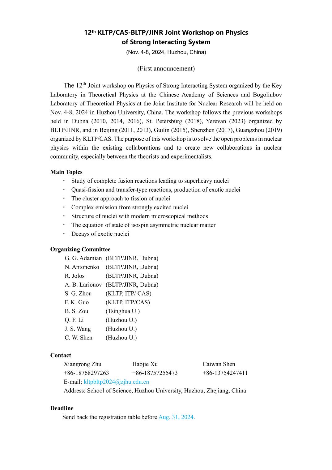 12th KLTP/CAS-BLTP/JINR Joint Workshop on Physics of Strong Interacting System