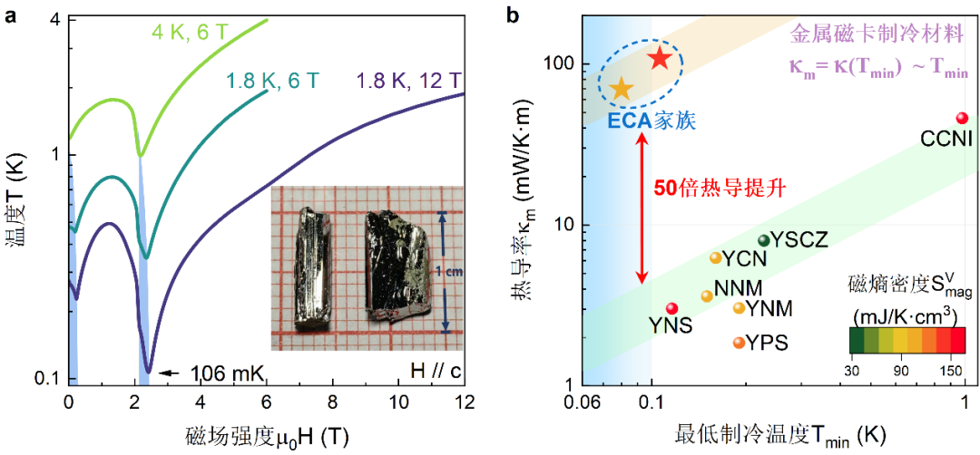 图3. (a) ECA材料的绝热去磁制冷测量,在自旋超固态量子相变点附近实现106mK最低制冷温度。(b)ECA材料的热导具有巨大优势,相比于此前报道的磁制冷材料,其热导率提升了1–2个数量级。