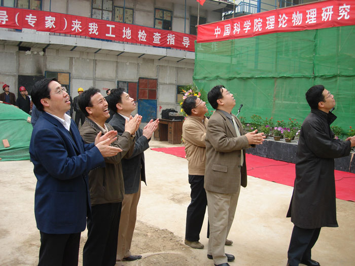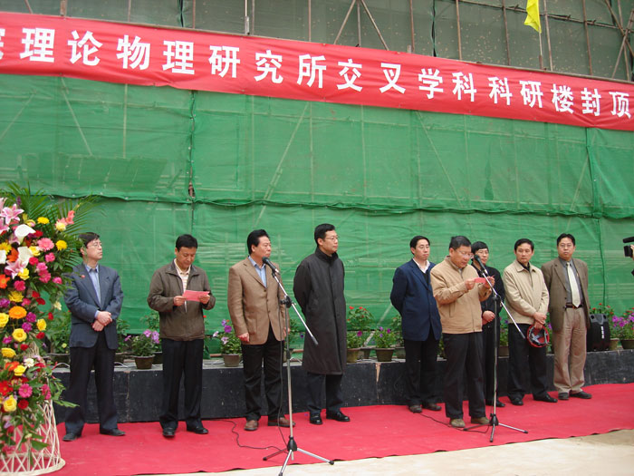 交叉学科科研楼举行结构封顶仪式。中科院基建局副局长王志刚,理论物理所副所长吴岳良,理论物理所副所长牟克雄,中科院物理所副所长冯稷,中科建筑设计研究院副总建筑师张京,北京鸿厦基建工程监理公司总经理孙吉圣,中国航空港建设总公司副总经理傅振华、总工程师杨玉生、项目经理宋会永,各分包单位领导和负责人及理论物理所职工参加了封顶仪式。