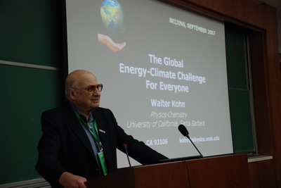 。这是他继2006年10月18日之后,再次访问理论物理所。陈晓松副所长主持,于渌院士、何祚庥院士、戴元本院士等参与了接待并与之亲切会谈。会谈期间,双方就世界能源问题交换了意见。上午十点半,Walter Kohn教授作了题为“全球能源-气候挑战:各方反应概览”的学术报告,指出能源-气候挑战的全球性,全球变暖正广泛地改变着地球的事实,以及科学、政治、经济等各方对这一挑战的反应。报告吸引了所内外近百人,会后提问踊跃。报告会结束之后,由于时间的关系,Kohn教授仍不忘参观理论所新建成的科研大楼,对理论所的科研环境大加赞赏。最后Kohn教授对基础科学特别是理论物理及其交叉学科的发展和未来提出了一些有益的建议,并在理论物理所的贵宾签名簿上留言。