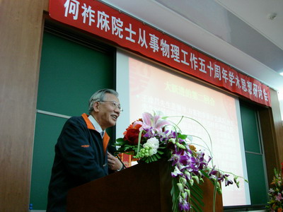 在这次研讨会上,中科院理论物理研究所学术委员会主任欧阳钟灿院士介绍了何先生的学术成就以及对我们国家和中科院理论物理研究所作出的贡献。刘寄星研究员介绍了早年与何先生一起共事的几件事。方守贤院士介绍了他与何先生早期共同为我国加速器发展和高能物理进行长期不懈努力,经受住了我国加速器项目八上七下艰辛考验的历程。张宗烨院士介绍了何先生当年作为研究组的支部书记如何在艰苦的环境下保护大家开展科研工作的情节。陈和生院士介绍了何先生为高能物理做出的贡献。黄祖洽院士用一首诗(附后)概括了何先生的贡献和个性特征。朱邦芬院士介绍了何先生作为清华校友为清华大学做出的贡献。孙汉城先生介绍了何先生在核能理论与实践中发挥的作用。黄涛研究员介绍了何先生在复合场理论方面的工作。