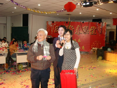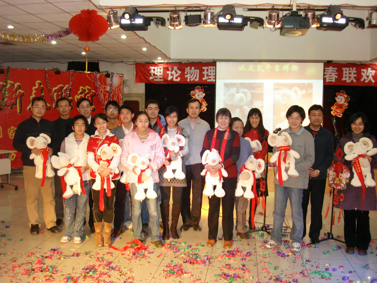2008年1月22日下午2:00,青年公寓6号楼三层报告厅张灯结彩,喜庆祥和。欢快的乐曲、缤纷的色彩营造出浓浓的节日气氛,收获的幸福与喜悦洋溢在会场的每一个角落,美好的祝愿与憧憬感染着在场的每一个人。在所工会的组织下,在团学会的大力协助下,理论物理所全体职工、离退休老同志、研究生、博士后及职工家属欢聚一堂,给寒冷的冬季带来丝丝暖意。