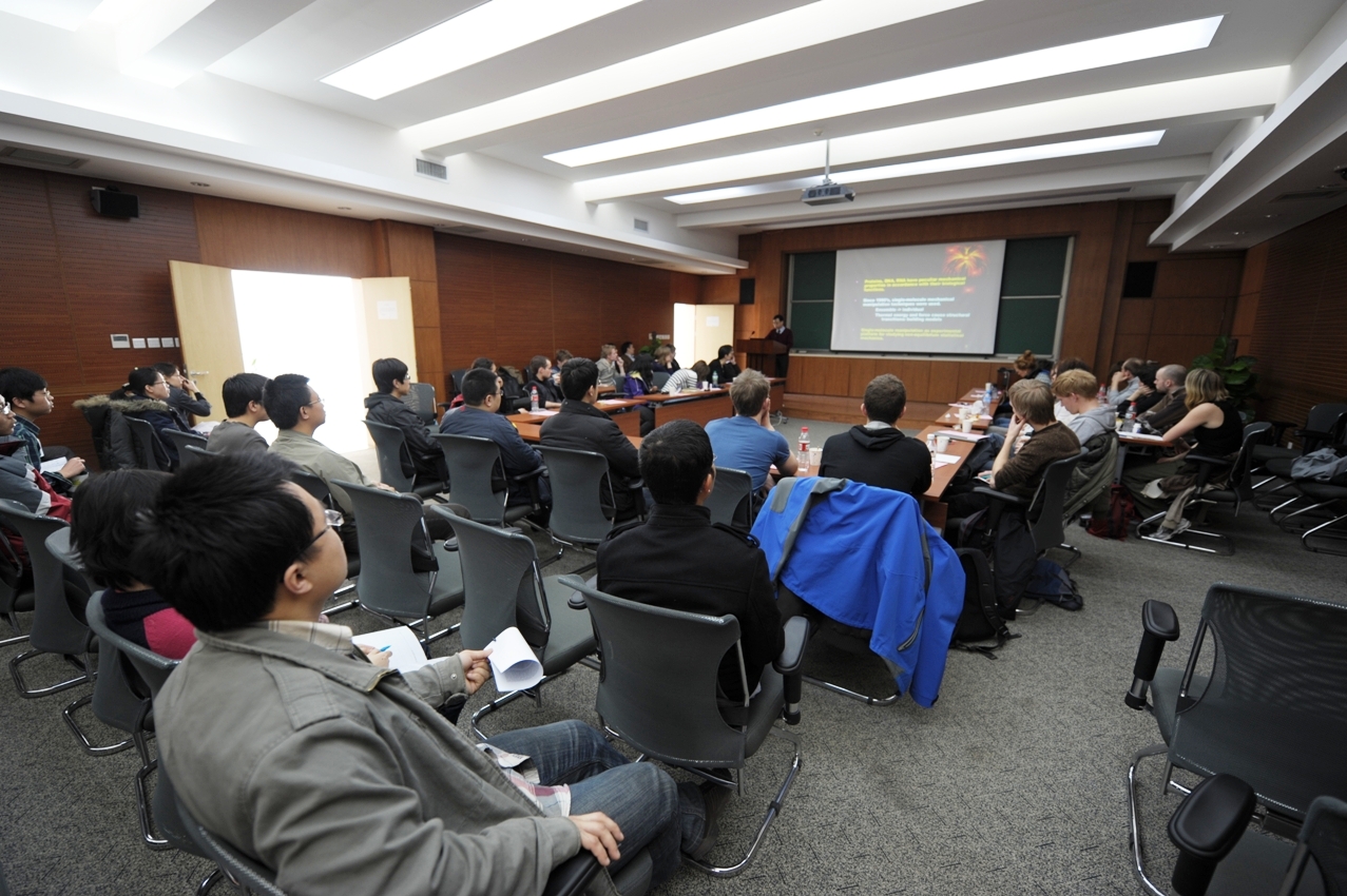 3月24日上午,理论物理研究所(ITP)接待了来自挪威科技大学(NTNU)纳米技术硕士班的学生访问团。上午九点十分,为访问团举行的欢迎会在理论物理所新楼报告厅举行。吴岳良所长、陈晓松副所长和周海军研究员以及理论物理所、清华大学的学生等参加了欢迎会。首先,吴岳良对访问团表示了热烈欢迎,并就ITP及卡弗里理论物理所的概况、新的运行模式、研究方向、发展目标等向学生们做了简要介绍,这次活动将成为KITPC 拓展项目的开端。因访问团的要求,KITPC项目管理办公室负责人庄辞博士向学生们介绍了中国科学院(CAS)的概况,并详细介绍了KITPC的成立、管理方式、运行项目的流程以及2007-2009年度运行项目的情况。随后,挪威科技大学纳米力学实验室主任张志良教授和学生代表详细介绍了NTNU的情况,尤其是2006年NTNU在斯堪的纳维亚首次成立了纳米技术的硕士班,每年从全挪威招收最顶尖的30名学生,自2006年起所招收学生的平均入学成绩排名为全国第一。此行的学生均来自挪威科技大学纳米技术硕士班,他们的研究方向分为:纳米材料,纳米生物学和纳米电子学。会上周海军研究员作了题为“生物膜与生物聚合物:弹性和结构转变”的报告。学生们还进行了自由讨论,讨论会和报告由陈晓松副所长主持。