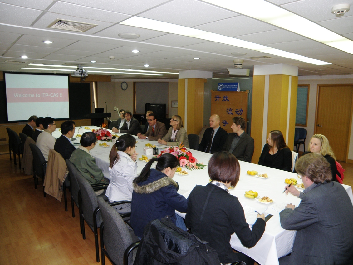 10月19日上午,瑞典青年科学家代表团一行12人对理论物理所进行了访问,团组成员包括7位2006年英瓦尔·卡尔松奖(Ingvar Carlsson Award)获得者、2位瑞典战略研究基金会(Swedish Foundation for Strategic Research)成员、2位瑞典驻华使馆参赞和1位使馆工作人员。上午九点三十分,与代表团的座谈会在理论物理所主楼报告厅举行,副所长陈晓松研究员、郑伟谋研究员、周海军研究员、王延颋副研究员及博士后等参加了会议。