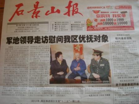 在曾经参加过抗日战争、解放战争、抗美援朝战争并在战场上负过伤的伤残军人、今年89周岁的李万和家,老人精神矍铄,激动地向领导们讲起了参加各次战争的经历以及幸福晚年生活。他首先感谢党和国家对他们这些曾经参加过战争的老同志的关心,感谢国家逐年提高他们的生活津贴和补贴以及医疗待遇,感谢所里总想着让离退休老同志一起共享研究所发展成果,感谢社区为老人们提供的各种方便服务措施。他还兴奋地拿出了1月12日的《石景山报》,在头版头条刊登了1月9日“军地领导走访慰问石景山优抚对象”的新闻,北京军区副参谋长陈建、石景山区区委书记荣华在李万和家与他亲切交谈的照片醒目地跃入人的眼帘。老人非常兴奋,激动地向领导们讲起了令同辈们羡慕的家庭生活,夫妻和睦、儿女孝顺、颐养天年。领导们衷心地祝愿老人健康长寿、阖家幸福。