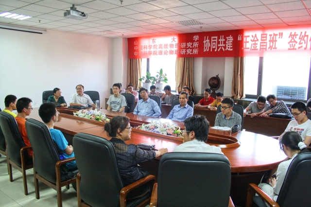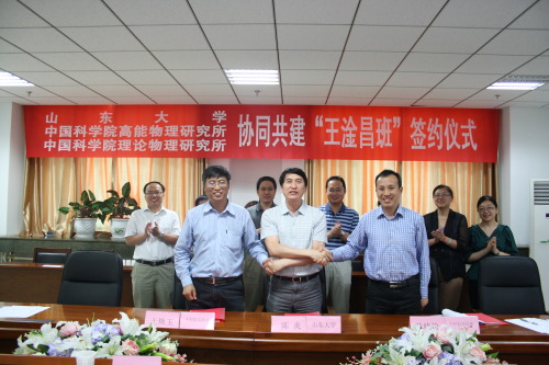 2013年6月13日,我所与高能物理所、山东大学协同共建“王淦昌班”签约仪式在山东大学物理学院举行。山东大学副校长陈炎、高能物理研究所党委书记兼副所长王焕玉、理论物理研究所副所长陈晓松等共同出席了签约仪式。仪式由山东大学物理学院院长陈峰主持。
