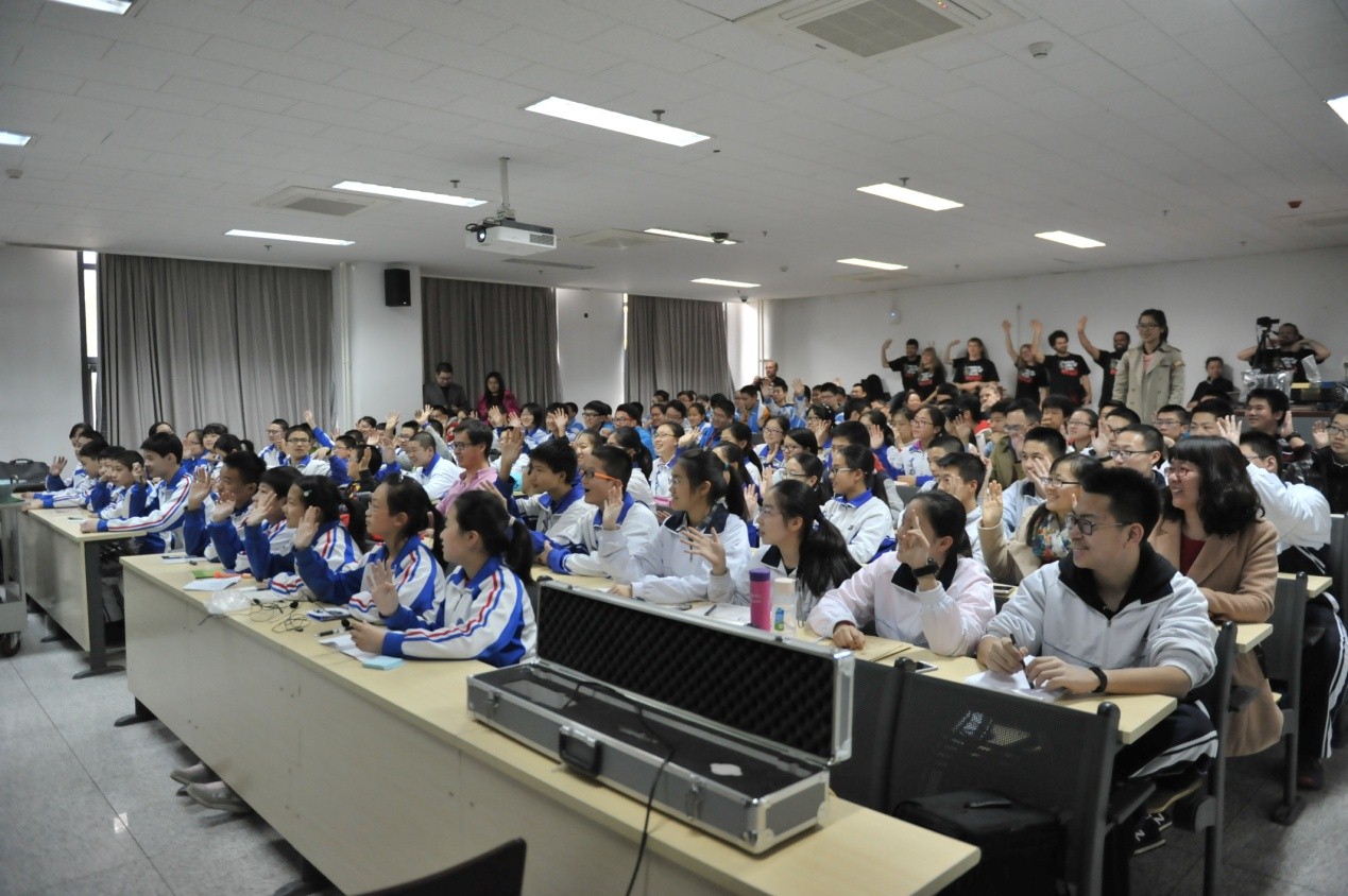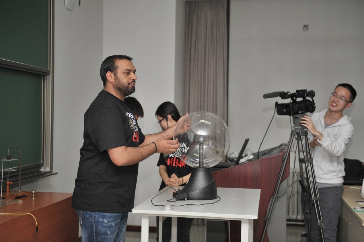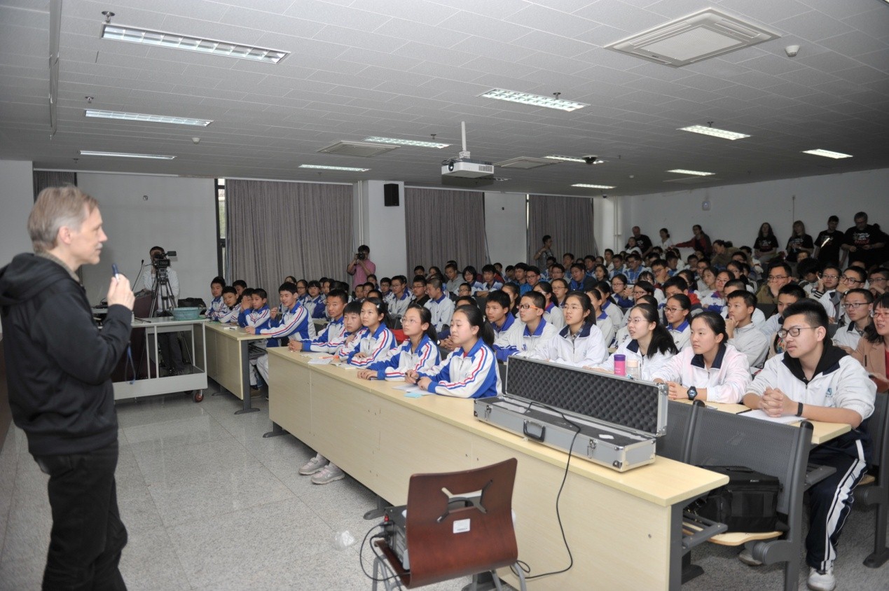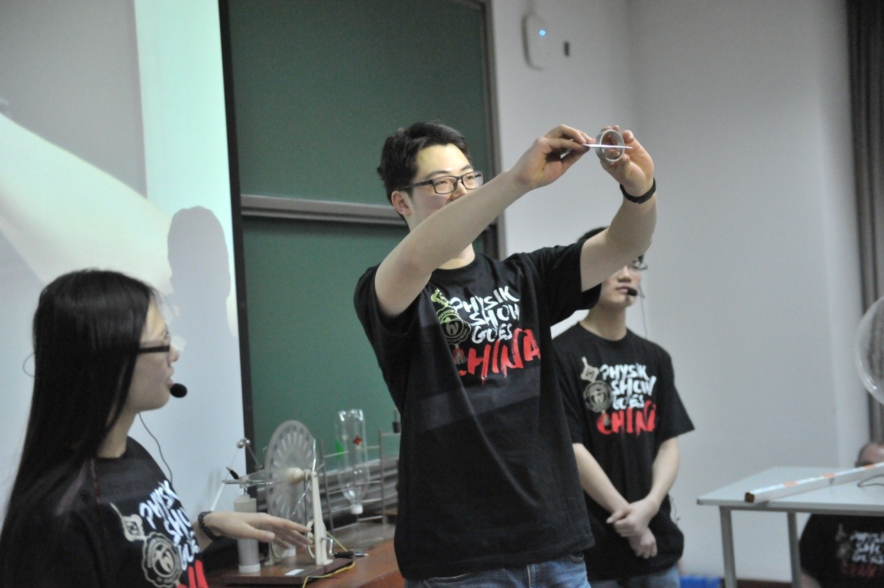 、北京大学和德国波恩大学共同主办,中科院行政管理局科学文化传播处协办,面向中学生的科普活动“物理秀(Physics Show)”于2016年3月22日在北京大学成功举行。此次“物理秀”活动是国家自然科学基金委和德国科学基金会共同资助的中德跨学科重大国际合作研究项目“强相互作用量子色动力学对称性及其物质结构”面向公众进行科学传播开展的一次科普活动,项目的中方首席科学家邹冰松研究员和德方首席科学家Ulf-G. Meissner教授也来到活动现场,与中学生们一起观看了“物理秀”。据欧洲科学院院士Meissner教授介绍,波恩大学团队在过去的十余年一直在做“物理秀”的科普活动,有很好的传统,在德国获得很大的成功,并且在欧洲其他国家也非常受欢迎,此次“物理秀”活动是第一次在欧洲以外的国家举办,也是第一次在中国举办。 此次“物理秀”活动的所有演示实验由中科院理论物理所、北京大学物理系和波恩大学数理学院的研究生共22人,经过为期4天的精心排练共同完成。他们通力合作,为中学生们带来了一场精彩有趣的关于声、光、电、磁等物理现象的演示实验,并将时空穿越的科幻故事穿插到整个实验过程中,利用日常道具展示出奇特的效果,最后将现象背后的物理学原理阐述出来,让中学生感受到了物理的奥妙,激发了他们对学习科学的浓厚兴趣。来自中科院附属实验学校、中科院中关村学校(中关村中学)、北大附中、清华附中、人大附中、首师大附中、57中、陈经伦中学、京源学校、中科启仁学校的一百多名中学生参加了此次“物理秀”活动。
