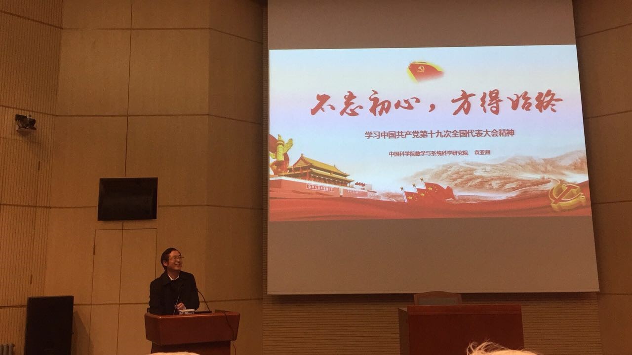 10月31日上午,我所组织全体党员参加了由中科院北京分院协作三片主办、数学院承办的学习贯彻党的十九大精神报告会。报告会在数学院思源楼报告厅举行。报告会上十九大代表袁亚湘院士作了题为《不忘初心,方得始终》的报告,向大家宣讲了习近平总书记在十九大上的报告精神。我所蔡荣根副所长(主持工作)、王延颋副所长、苏肇冰院士、欧阳钟灿院士、张肇西院士等党员参加了报告会。