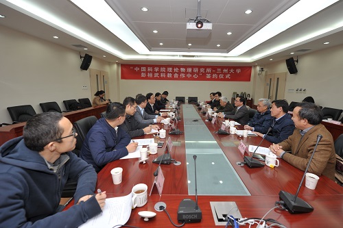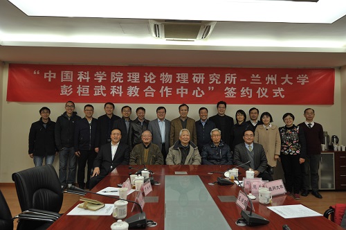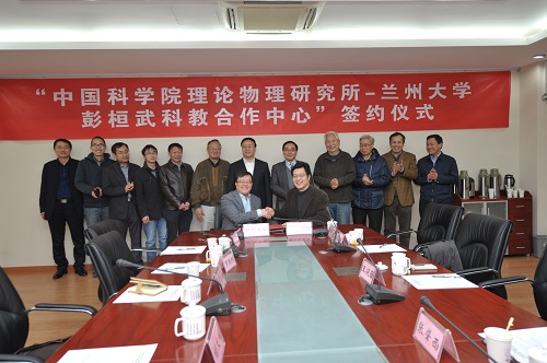 —兰州大学彭桓武科教合作中心”的筹建背景以及协议起草、中心运作计划等情况。 兰州大学党委书记袁占亭首先感谢理论物理所能够与兰州大学开展合作,指出兰州大学地处西北,一直听党的话,为国家做贡献,是一个投入产出比很高的学校,有着优良的学风,师生甘坐冷板凳。兰州大学物理学院与理论物理所有着深厚的合作基础。从老一辈理论物理学家开始,双方就一直交流不断。他指出天时不如地利,地利不如人和,人和不如遇上了大时代。党的十九大的召开,对科技界来说,我们迎来了一个好时代。兰大地理位置较偏,之前错失了许多机会,面临着很多危机。理论物理所位于科技前沿,在科研方面有许多优势,他希望通过与理论物理所开展全方位的合作,使兰州大学能够更好地参与到国家战略计划中来,希望理论物理所在人才交流、科研项目、学生培养等方面给予兰州大学大力支持,希望双方可以建立会商机制,循序渐进,将双方的合作加深、加宽,实现双赢、多赢。 随后,兰州大学副校长徐生诚,中科院力学所胡文瑞院士,理论物理所欧阳钟灿院士,张肇西院士先后讲话。大家表示很高兴看到双方签署这样的合作协议,并为中心的运作提出了许多很好的建议。双方强调,要以签署合作协议为契机,创造性地落实党的十九大精神,面向国家战略需求,真抓实干,深化合作领域,丰富合作内容,将合作做深、做实,将彭桓武科教合作中心扎扎实实办好。 理论物理所研究室,院重点实验室,彭桓武理论物理创新研究中心,综合处,科研处,人事教育处,兰州大学党委办公室、物理科学与技术学院、科研处等相关负责人参加了签约仪式。