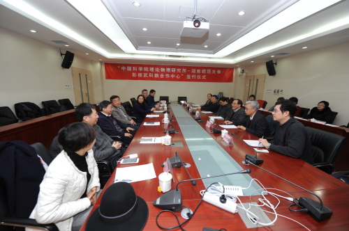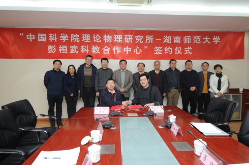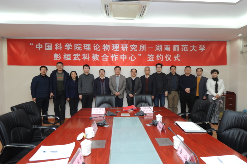 —湖南师范大学彭桓武科教合作中心”的筹建背景、中心运作计划等情况。 签约仪式后,双方进行了亲切的座谈,理论物理所欧阳钟灿院士,湖南师范大学匡乐满副校长等先后讲话。大家表示很高兴看到双方签署这样的合作协议,现在国家各项事业蒸蒸日上,高度重视基础研究,特别是不久前国务院印发了《关于全面加强基础科学研究若干意见》,更是为基础研究提供了制度层面的支持和保障。借着国家科技政策的东风,以签署合作协议为契机,双方可以优势互补、合作共赢,走出一条人才培养和学术交流的新路。 理论物理所研究室、院重点实验室、彭桓武理论物理创新研究中心、综合处、科研处、人事教育处、湖南师范大学党委办公室、科技处、人事处、物理与信息科学学院等相关负责人参加了签约仪式。