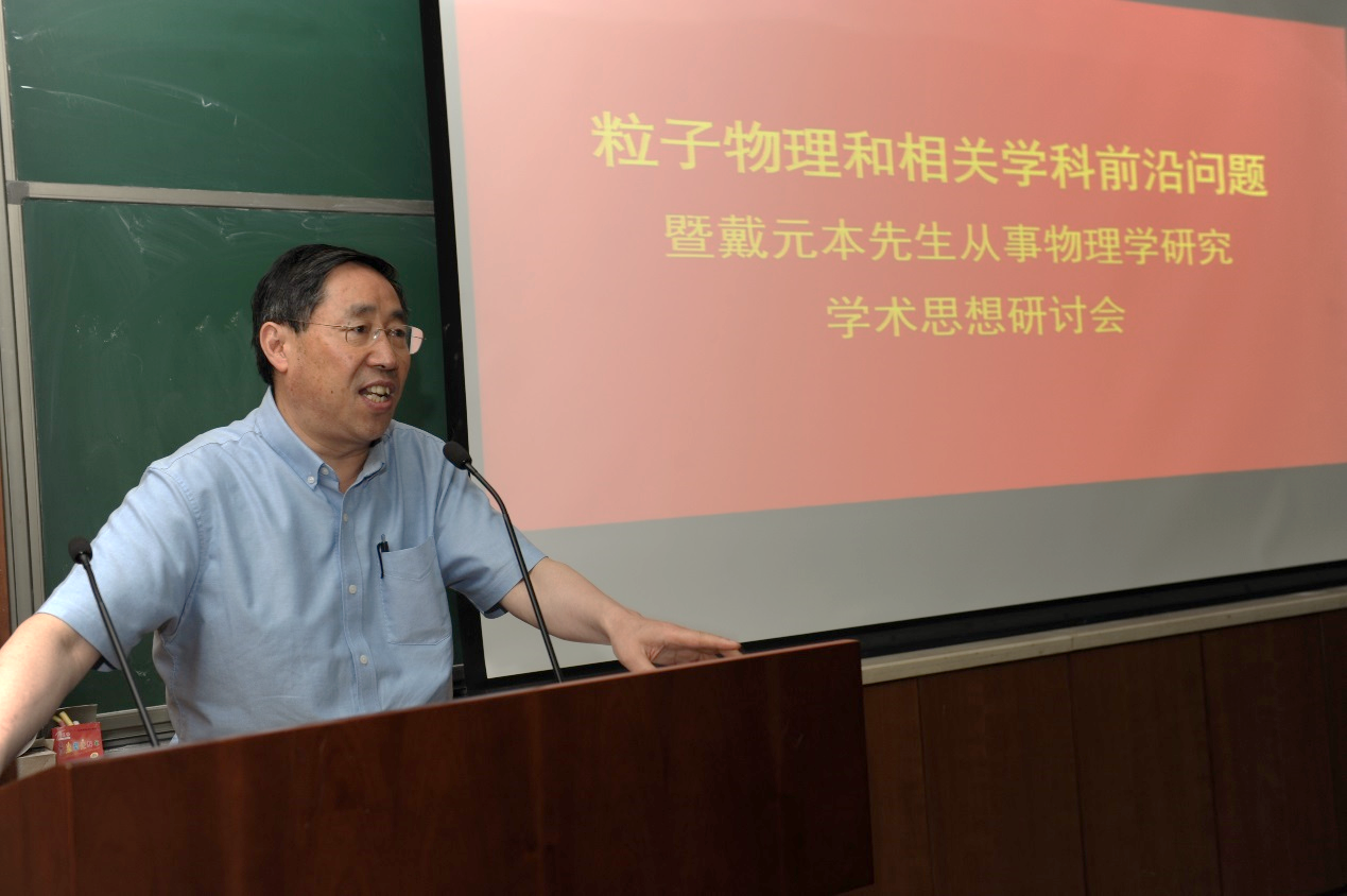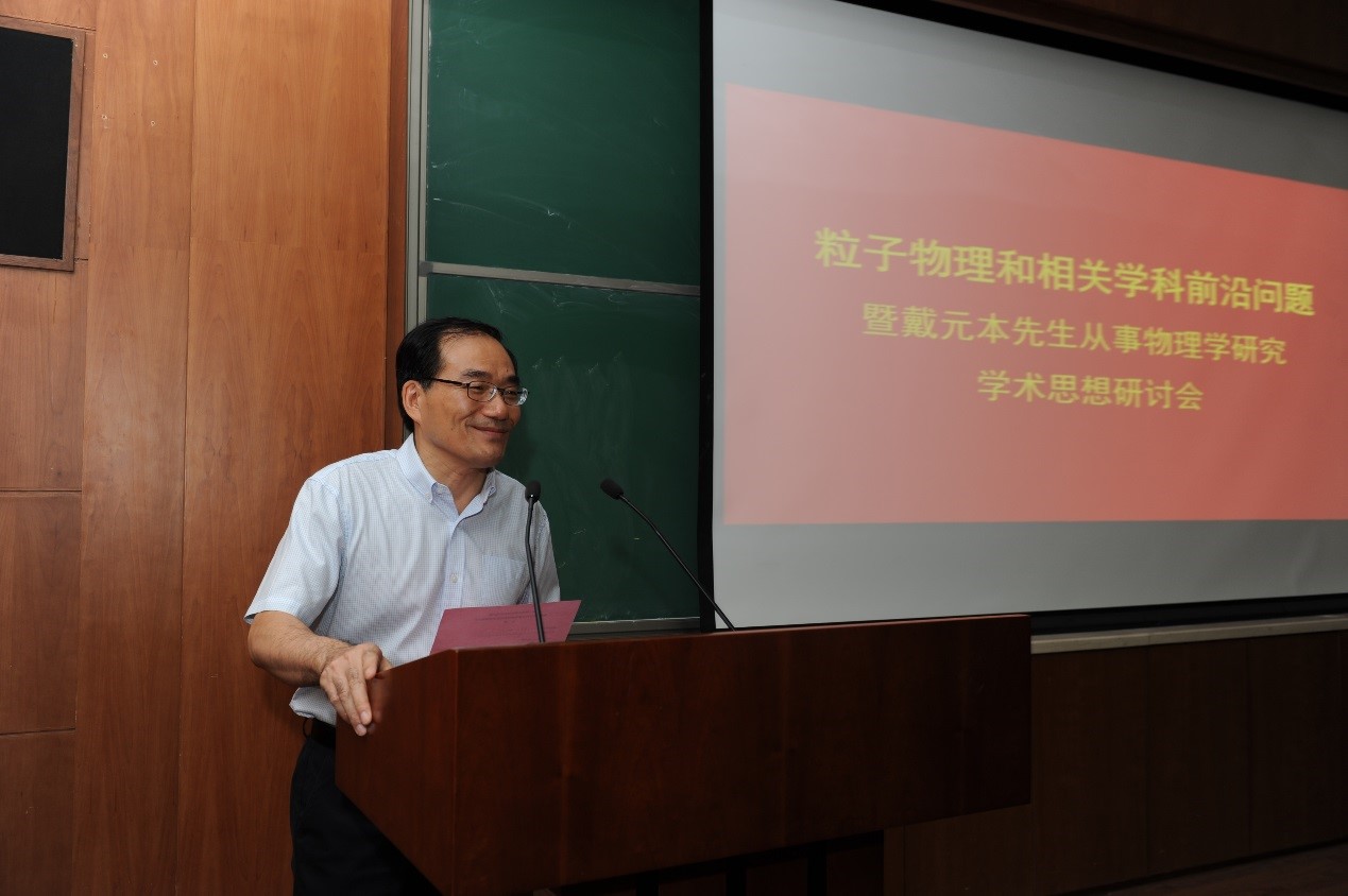 下午的研讨会上,围绕戴元本先生的学术历程,邀请了清华大学陈少敏教授作了题为“兆电子伏能区中微子实验与物理进展”的学术报告,高能所周顺研究员作了题为“中微子理论进展汇报”的学术报告,北京大学曹庆宏研究员作了题为“LHC上的顶夸克和希格斯物理”的学术报告,理论物理所舒菁研究员作了题为“电弱对称性破缺(质量起源)的新进展”的学术报告,浙江大学朱华星教授作了题为“Regge Physics and Factorization Violation in High Energy Scattering”的学术报告,理论物理所杨刚研究员做了题为“五圈色因子-动量因子的对偶和量子引力”的学术报告,对戴元本先生的学术思想和治学精神进行了更加深入的学习和研讨。  蔡荣根院士主持  欧阳钟灿院士宣读白院长贺信  北京大学朱世琳代读赵光达院士贺信  清华大学王青代读邝宇平院士贺信  高能所张宗烨院士发言  高能所黄涛研究员发言  南京大学物理学院院长李建新教授发言  理论物理所何祚庥院士发言  理论物理所张肇西院士发言  理论物理所/国科大吴岳良院士发言  物理所杨国桢院士发言  戴元本先生发言