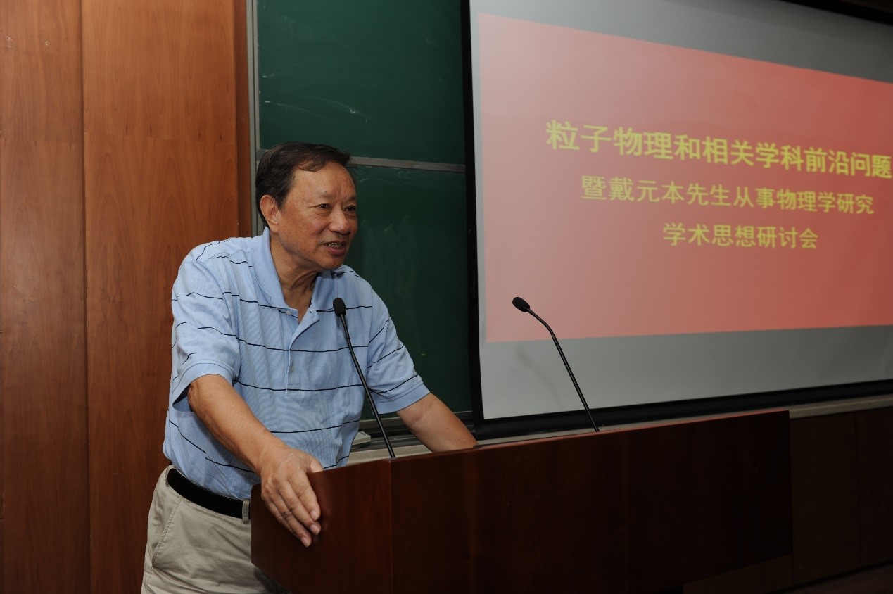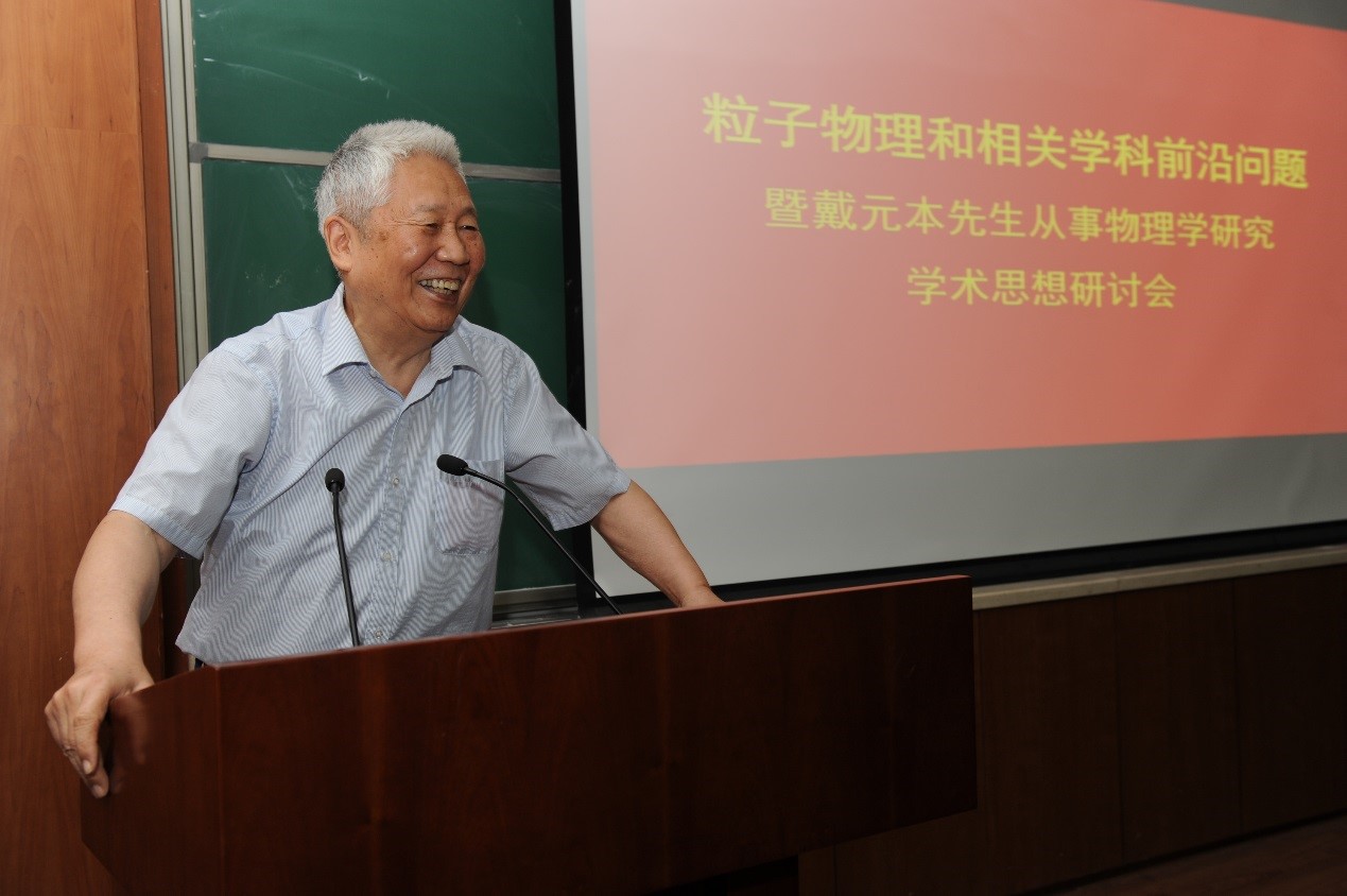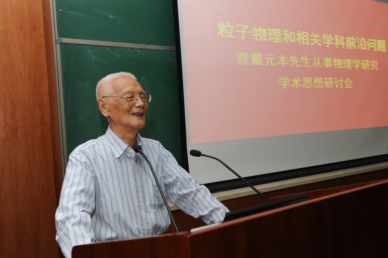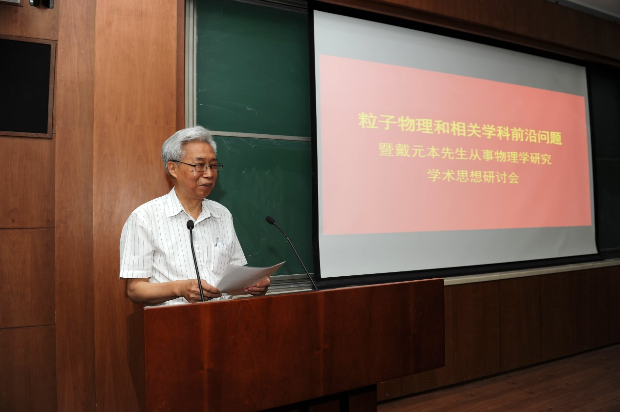 上午的会议由理论物理研究所副所长(主持工作)蔡荣根院士主持。首先,欧阳钟灿院士代表学部主席团宣读了白春礼院长给戴元本先生的贺信,贺信中说道:“您追求真理、不懈探索,在粒子物理理论和量子场论学术研究方面硕果累累;您德育群芳、严谨治学,为我国物理学科发展和人才培养做出了卓越贡献;您言为士则、行为世范,教育并激励了一大批科技工作者!”随后,北京大学朱世琳教授代读了赵光达院士的贺信,清华大学王青教授代读了邝宇平院士的贺信。 在接下来的发言中,戴先生的好朋友们,高能物理所张宗烨院士、数学与系统研究院周龙骧研究员、北京大学宋行长教授、高能物理所黄涛研究员介绍了戴先生的学术成就,并回忆了与戴先生一起合作共事时的难忘经历。戴元本先生是我国著名理论物理学家,主要从事粒子物理理论和量子场论方面研究工作。戴元本先生的一项重要工作是层子模型的研究,层子模型工作获1982年国家自然科学二等奖。在量子场论方面,戴元本先生首先提出用重整化群方程研究物理粒子的电磁形状和大角度散射的方法,使得能够利用重整化群方程讨论实际问题。戴元本先生还研究了非Abel规范场六阶微扰论中费米子电磁形状因子的渐近行为,他通过大量计算最初提出领头项指数化的猜想。戴元本先生的其它工作还涉及到手征自发对称破缺的新计算方法、中微子物理和重味物理等问题。戴元本先生编撰的《相互作用的规范理论》,是几代粒子物理专业研究生的重要参考书,对于推动中国的规范理论研究起了重要作用。高能所黄涛研究员用“治学严谨、为人厚道”八个字来概括戴先生的学术生涯, 大家对戴元本先生严谨的治学精神、对我国早期理论物理事业的贡献和推动,以及对年轻的科技工作者的提携和培养表达了崇高的敬意!