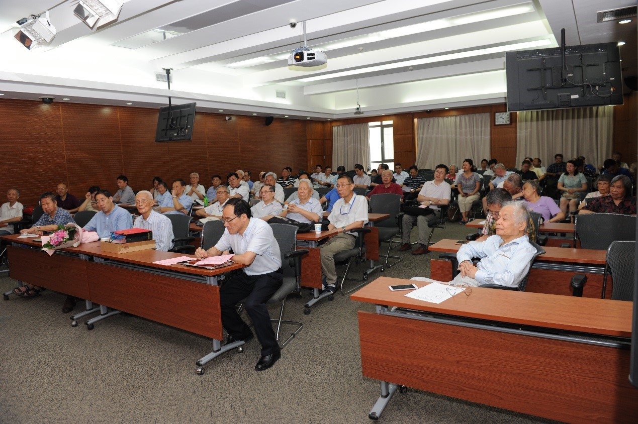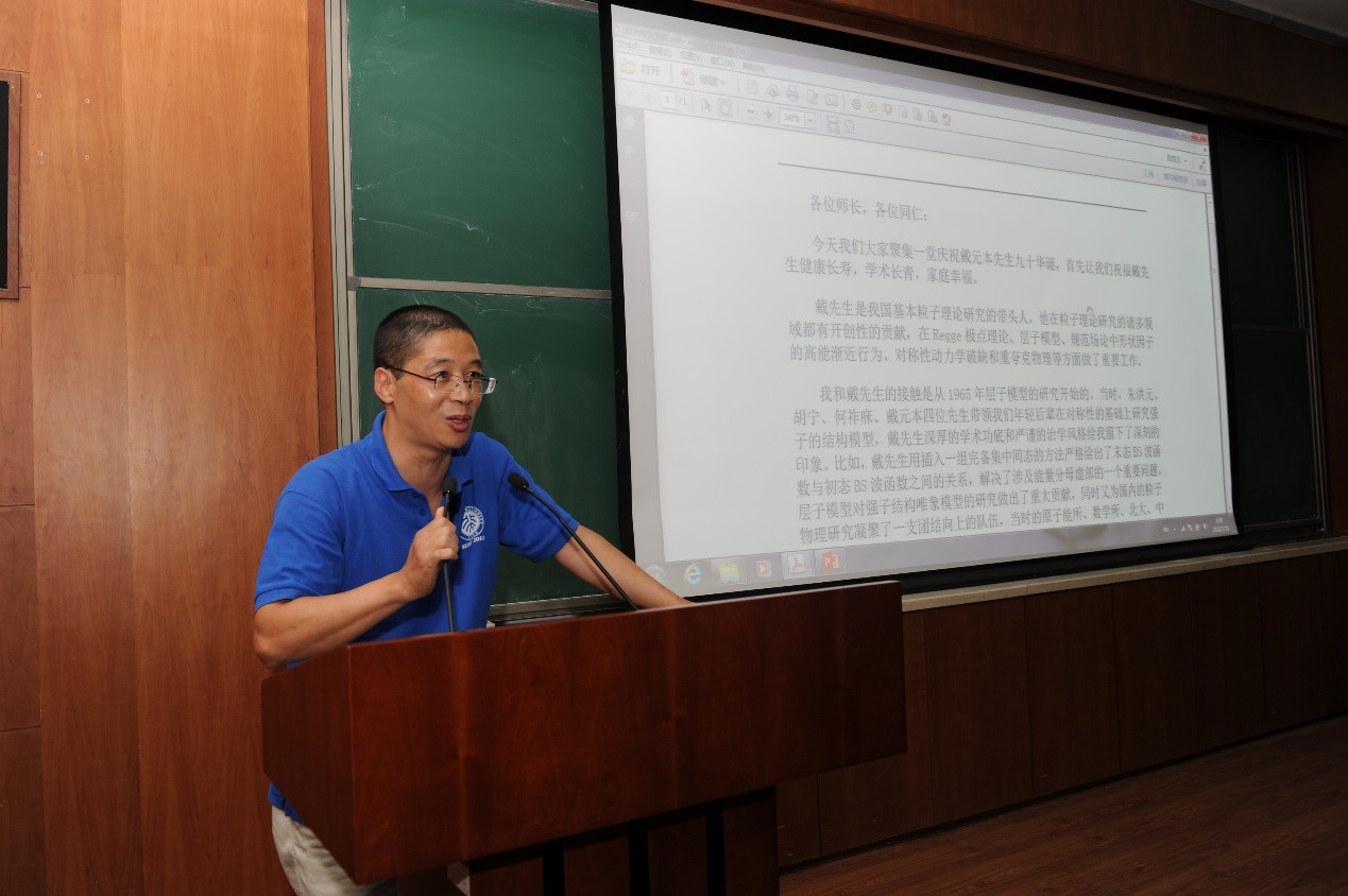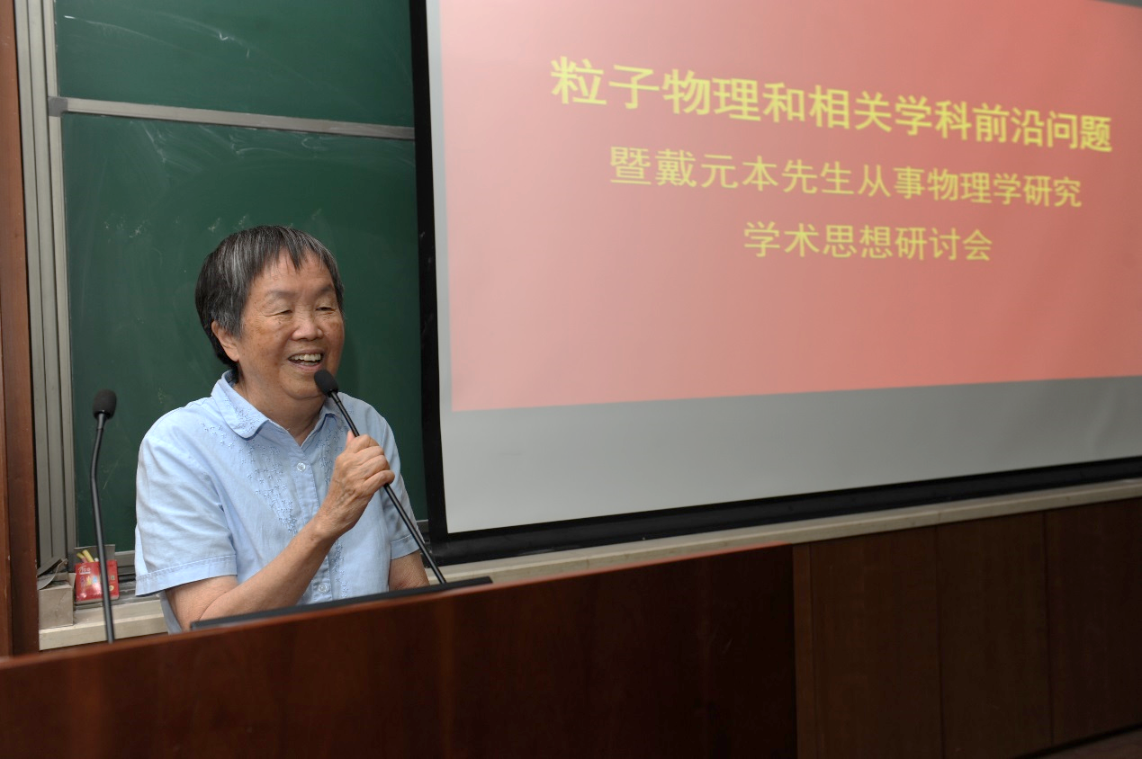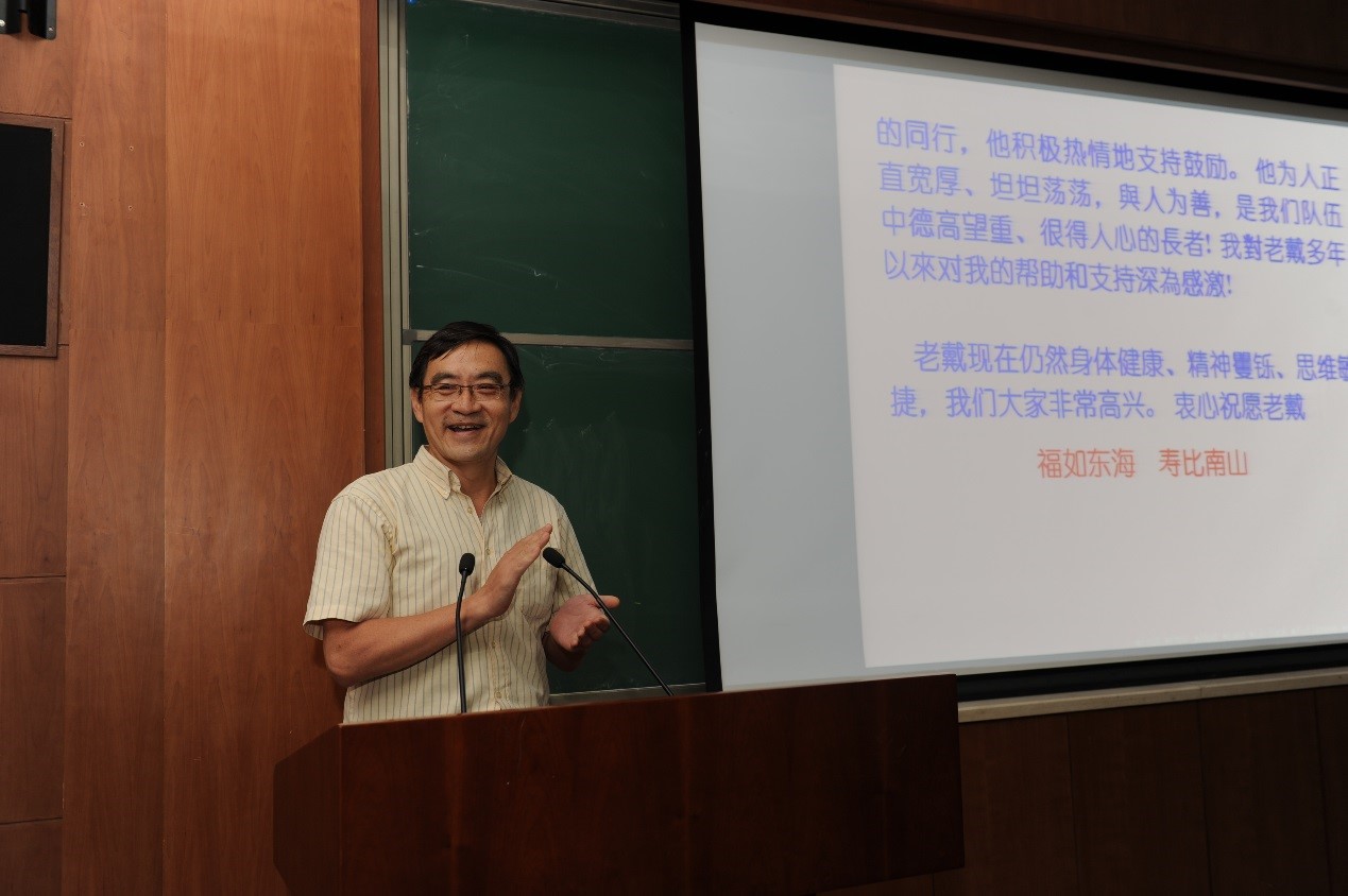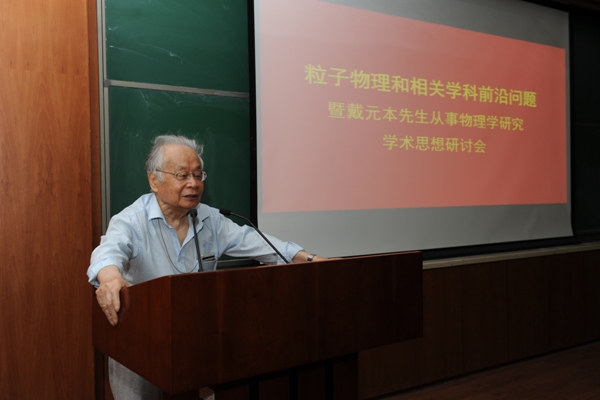 上午的会议由理论物理研究所副所长(主持工作)蔡荣根院士主持。首先,欧阳钟灿院士代表学部主席团宣读了白春礼院长给戴元本先生的贺信,贺信中说道:“您追求真理、不懈探索,在粒子物理理论和量子场论学术研究方面硕果累累;您德育群芳、严谨治学,为我国物理学科发展和人才培养做出了卓越贡献;您言为士则、行为世范,教育并激励了一大批科技工作者!”随后,北京大学朱世琳教授代读了赵光达院士的贺信,清华大学王青教授代读了邝宇平院士的贺信。 在接下来的发言中,戴先生的好朋友们,高能物理所张宗烨院士、数学与系统研究院周龙骧研究员、北京大学宋行长教授、高能物理所黄涛研究员介绍了戴先生的学术成就,并回忆了与戴先生一起合作共事时的难忘经历。戴元本先生是我国著名理论物理学家,主要从事粒子物理理论和量子场论方面研究工作。戴元本先生的一项重要工作是层子模型的研究,层子模型工作获1982年国家自然科学二等奖。在量子场论方面,戴元本先生首先提出用重整化群方程研究物理粒子的电磁形状和大角度散射的方法,使得能够利用重整化群方程讨论实际问题。戴元本先生还研究了非Abel规范场六阶微扰论中费米子电磁形状因子的渐近行为,他通过大量计算最初提出领头项指数化的猜想。戴元本先生的其它工作还涉及到手征自发对称破缺的新计算方法、中微子物理和重味物理等问题。戴元本先生编撰的《相互作用的规范理论》,是几代粒子物理专业研究生的重要参考书,对于推动中国的规范理论研究起了重要作用。高能所黄涛研究员用“治学严谨、为人厚道”八个字来概括戴先生的学术生涯, 大家对戴元本先生严谨的治学精神、对我国早期理论物理事业的贡献和推动,以及对年轻的科技工作者的提携和培养表达了崇高的敬意!