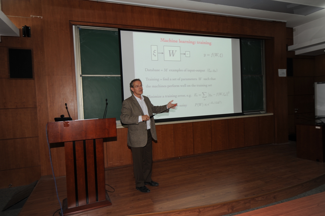 由中国科学院理论物理研究所彭桓武理论物理创新中心资助的“物理、推断与学习”冬季学习与国际研讨会于2018年10月28-11月3日在中国科学院理论物理研究所成功举行。 该冬季学校邀请了法国巴黎高师校长Marc Mézard教授、美国圣塔菲研究所Cristopher Moore教授、 日本东京工业大学Yoshiyuki Kabashima教授、意大利都灵理工大学Alfredo Braunstein教授、中科院物理研究所王磊研究员、人民大学谢志远教授等六位活跃于统计物理与机器学习国际前沿的学者为教员,讲授信念传播、期望传播、复本方法、空腔方法、统计生成模型、张量网络、统计推断、感知学习、玻恩学习机、多层深度网络等基础理论和现代计算方法。在随后的国际研讨会上,有来自中国大陆高校及研究所,华为,腾讯等知名企业、香港地区、美国、英国、日本、意大利、瑞典等地的21位邀请报告人就统计物理、统计推断、机器学习的前沿问题汇报进展,讨论未来发展方向。参加冬季学校和国际研讨会的与会学者和学生人数接近80人。该冬季学校和国际研讨会的授课和邀请报告内容也已经传到网络上供感兴趣的研究人员参考,见网址 http://pil2018.csp.escience.cn  周海军研究员致辞  Marc Mézard教授作报告  会场情况  会议合照 |