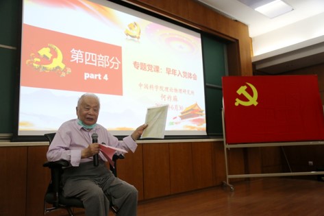 会上,何祚庥院士谈了1947年时入党的体会。他回顾了自己的入党初心,生动地讲述了追随中国共产党救国、救民的入党经历,诠释了老一辈科学家求真、务实、爱国、奉献的精神。他希望全体党员不忘初心、牢记使命,认真学习马克思主义理论,不断总结经验教训,在新时代发展马克思主义,把为共产主义奋斗终身作为大理想、大目标。
